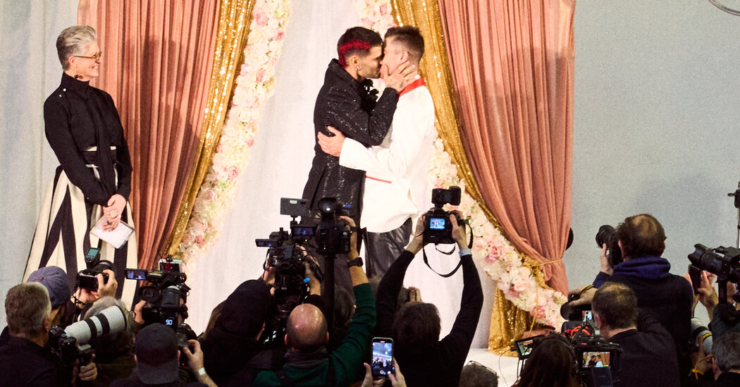 O altar Os noivos projetaram o altar, com uma mistura de veludo e lantejoulas, na frente da qual os modelos e os pais da passarela. “Nós o baseamos em referências antigas de filmes”, disse Bowen. Após o casamento, a presença do que o Sr. Bowen chamou de “muitos tipos muito sérios de fashionistas”, o casal recebeu votos de outros designers e pessoas da indústria. “Ficamos humilhados e surpreendidos pela resposta”, disse ele.